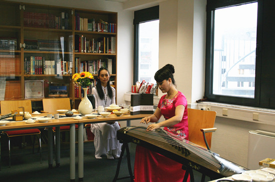24日,中国艺术研究院研究员苑利,专业茶道师侯雪艳,中国歌剧舞剧院古筝演奏家李凡,中国书画家协会副主席张军平等专家应杜塞尔多夫大学孔子学院邀请,为德国民众带来了一场茶香弥漫、墨彩飞扬和乐韵鼓动的茶艺主题晚会。表演者巧妙地将品茶、听琴、讲座和赏画结合起来,在古朴悠扬的琴声和浓淡相宜的现场书画背景下,五十余位来宾细细品味中国茶所特有的文化和韵味。