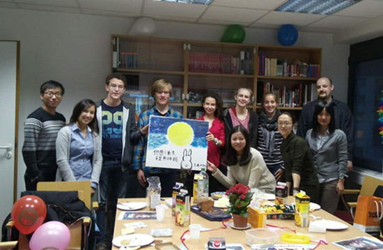 25日,孔子学院中学生汉语班师生里热闹非凡:有的同学带来自己烤制的“月饼”;有的同学一边播放视频,一边兴奋地讲述自己7月份在北京度过的夏令营时光;有同学开心地拿出了刚收到的HSK一级考试证书,还有的秀起了中文歌。同学们和老师共同拿起画笔,融合中西“技法”,合作完成了一幅题为“但愿人长久,千里共婵娟”的图画。他们把这幅作品送给孔子学院,以此庆祝中秋节,庆祝孔子学院日。