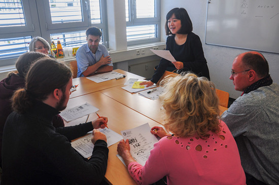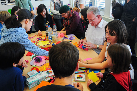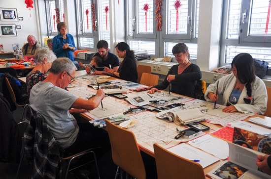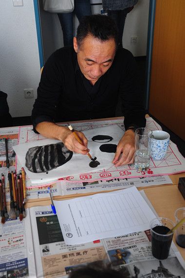 除了往年的常规活动外,今年海德堡大学孔子学院还邀请了著名法藉华裔画家陈江红先生来到活动现场,指导小朋友学画中国画。陈江红先生的创作取材于中国民间传说与神话,基于国画技法且富于创新,其作品广受德国儿童的喜爱。这次他携《愚公移山》和《渔童》两部作品来参加开放日活动。现场的小客人们与自己喜爱的画家一起泼墨挥毫,各个兴趣盎然。开放日活动的下半场是“陈江红作品朗诵会”,30余位来宾参加了朗诵会,并就作品的内涵、创作理念、中国艺术与西方观众的接受等问题与画家进行了交流和互动。