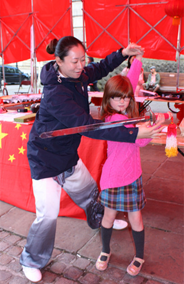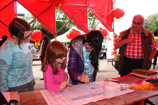 25日,兰开夏中央大学孔子学院在普雷斯顿市中心广场参与当地“人民大篷车”流动艺术展示活动,欢庆“孔子学院日”。活动现场,多轮驱动的红色大篷车、活蹦乱跳的中国卡通版狮子、高高挂起的大红灯笼、铿锵激越的锣鼓声吸引了众多当地民众围观。孔院教师徐菡、董莉芳以及志愿者热情邀请观众亲自动手,练习中国书画。喜气洋洋的中国舞狮节目颇受大家喜爱,呆萌可爱的小狮子招来很多小朋友拍照留念。孔院教师张颖为大家带来了精彩的陈式太极拳和杨式太极剑表演,她的一拳一剑,刚柔相济,动静相间——行云流水般的动作赢得了在场观众的阵阵掌声。外方院长余斐霞随后邀请观众登场互动,大家共练太极拳和太极扇。一招一式,赏心悦目。
