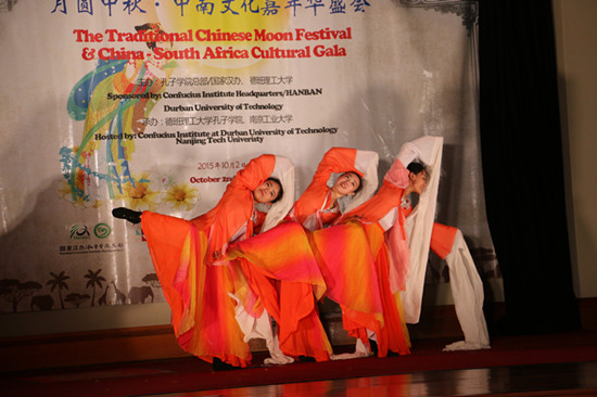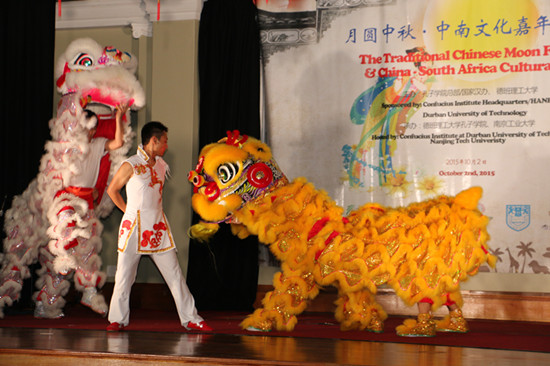 当地时间10月2日,南非德班理工大学孔子学院举办“月圆中秋·中南文化嘉年华”大型庆祝活动,南京工业大学学生艺术团、德班黑狐武术队和南非当地著名祖鲁艺术团“跨玛舒艺术团”(Kwamashu Community Art Project: CRE/DANCE Troupe )应邀献上一场精彩的中南文化艺术盛宴,来自德班市政府、德班理工大学、德班当地社区和德班侨界的300余人参加此次盛会。