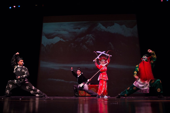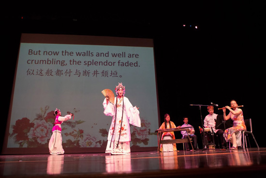 演出以舞狮开始。接着,国家一级演员、戏曲孔院中方院长涂玲慧教授的一曲新编京剧《梨花颂》回肠荡气,使人耳目一新。精彩的节目一个接一个,包括中国戏曲学院程世君教授、笛子专家领衔的民乐合奏《喜洋洋》和《紫竹调》,宾汉顿大学张泓教授的独唱《高原蓝》和《赶圩归来》,昆曲《游园》,京剧《扈家庄》《卖水》和《白水滩》等。美国观众对精彩纷呈的演出以鼓掌和叫好来表达高度的赞赏。