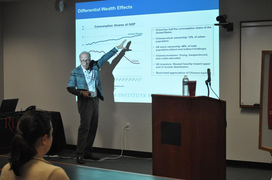 当地时间10月1日,美国耶鲁大学(Yale University)资深经济学教授、摩根斯坦利银行亚洲(Morgan Stanley Asia)前主席、著名经济学家史蒂芬·S·罗奇(Stephen·S·Roach)应新泽西州立罗格斯大学孔子学院邀请,为罗格斯大学百余名师生举办了一场中美关系讲座。