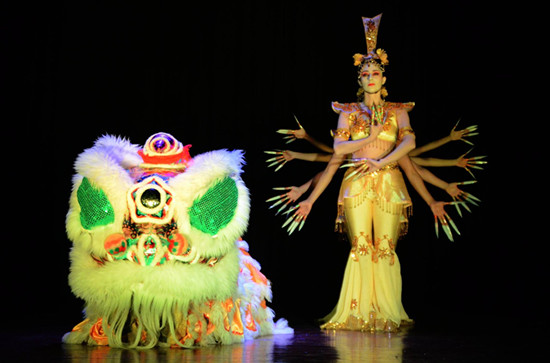 在古筝优雅的伴奏下,4位舞姿灵动的女子手持花纸伞,翩翩起舞,将观众带入山灵水秀的江南水乡。在这美若仙境的山水中,剧中主人公——一只栩栩如生的舞狮活灵活现地出场了,正如白居易在诗中描写的那样,“假面胡人假狮子,刻木为头丝作尾。金镀眼睛银贴齿,奋迅毛衣摆双耳”。演绎了观音唤狮、龙狮相斗、狮护太宗三个有关狮子的中国神话故事。第一场,自由奔放的狮子,被天神压在山下动弹不得。它苦苦哀嚎,奋力挣扎却无能为力。心怀天下、普渡众生的观音菩萨十分怜悯这头可爱的狮子,便用一曲美轮美奂的千手观音舞为狮子超度,使天性活泼的狮子重获新生。在二胡和长笛极具动感的少林音乐伴奏下,狮子与真天龙天子相遇,他们打斗嬉戏,比武争雄,狮子腾空跳跃,巨龙翻滚游动。台上打得酣畅淋漓,台下看得眼花缭乱,呼喊声、喝彩声此起彼伏。下半场,音乐柔和舒缓。身着黄袍的太宗皇帝梦见雄狮依偎,温顺安详。得知这是吉兆后,决心励精图治,做一个奋发有为的好皇帝。