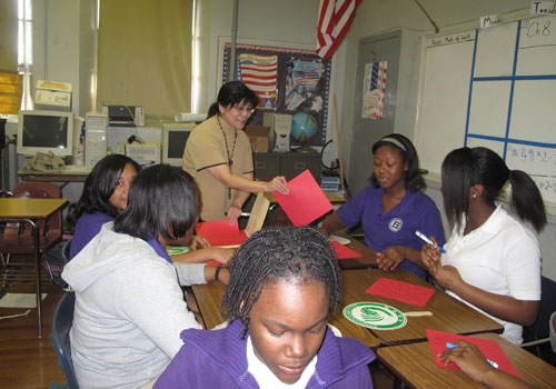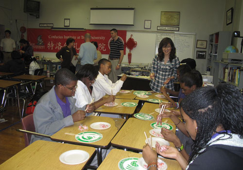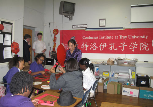 2011年2月15日下午两点半,特洛伊大学孔子学院在蒙哥马利的Baldwin 中学与学生一起庆祝兔年春节。特洛伊大学孔子学院为这次庆祝做了精心的准备,从准备食物、组织游戏到布置教室,一切都安排的井然有序。春节庆祝分三个板块进行,即剪纸游戏、书法练习和筷子游戏,每个环节都设有奖品。为了让组织更加缜密有序,二十多名学生分成三个小组,每组一个指导教师,轮流参加三个活动。三个活动的进行都是以极为有效的方式进行的,学生们一边动手做,一边学说汉语,同时组织人员做文化讲解,学生们积极参与,提出了很多和中国文化有关的问题,互动气氛十分热烈。在欢快的游戏结束后,邀请学生享受中国传统美食--饺子、春卷和炒饭等,学生们对中国的美食充满兴趣。