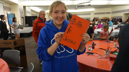 书法是中国特有的传统艺术形式,积淀着中华民族的历史智慧。而筷子作为中国特色的餐具,象征着中国丰富多彩的饮食文化。在中国老师和学生志愿者的指导下,参与者不仅学会了如何使用筷子,还能用毛笔写出自己的英文和中文名字。中华文化体验意犹未尽,文艺表演又在一片欢乐的气氛中继续进行。