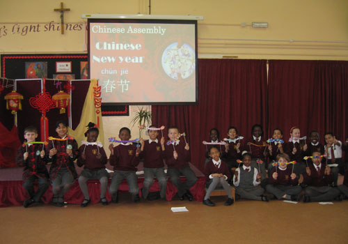2011年2月16日伦敦中医孔子学院孔子课堂圣约瑟夫小学全体师生迎来了一场别开生面的汇报表演。本次汇报表演的主题是中国春节。来自于伦敦中医孔子学院的汉语志愿者李健美和该校教师Fiona Jackson协助该校的20名学生向全校师生介绍了中国的农历春节,同时还汇报了该校学生学习汉语的情况。