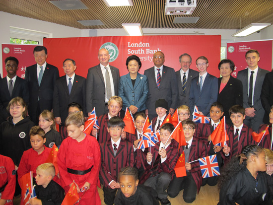 刘延东与伦敦南岸大学中医孔子学院及其下设孔子课堂的师生合影。(摄影:张春燕)