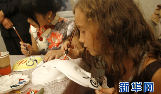 罗马尼亚小朋友学画京剧脸谱。新华社发(佩特雷斯库摄)