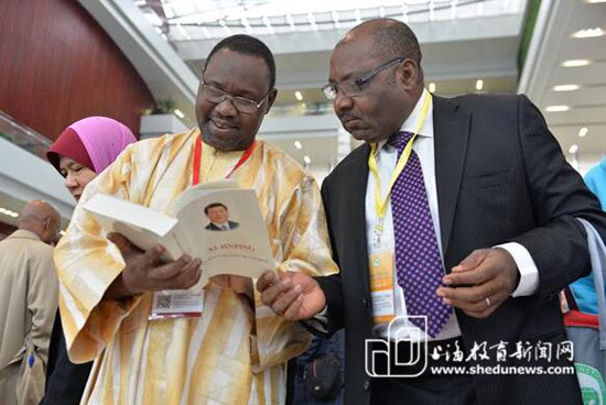 12月6日,参加第十届孔子学院大会的代表正在汉语教材展上翻阅汉语书籍。 (摄影:刘晓晶)