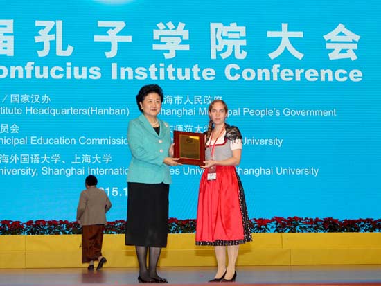 12月6日,第十届全球孔子学院大会开幕式在上海举行。国务院副总理、孔子学院总部理事会主席刘延东出席并致辞,为全球孔子学院先进个人和先进单位颁奖。新华社记者 刘颖 摄
