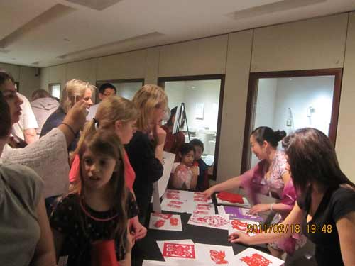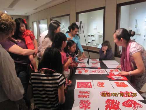 玉石展厅则是另外一种景象,黄老师的剪纸艺术老少咸宜。父母亲陶醉在中国的艺术技巧中,咔嚓几下,一个红色兔子栩栩如生。惊叹之际,父母亲也来学学技艺,在黄老师的指导下剪个小玩意儿;小孩则被美丽的作品所吸引,十二生肖,花鸟鱼虫,福禄寿喜,山水人物,五彩缤纷,满桌子的艺术品让他们大饱眼福。当知道还可以免费各取所需,那当然乐坏了这些学童。刚过元宵,正好周末,来自世界不同族裔的人们在这里融入中国文化,共享兔年祥和。