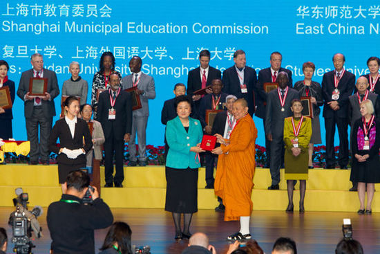 孔子学院总部理事会主席刘延东为孔子学院先进集体和个人颁奖,为示范孔子学院颁发证书,宣布成立孔子学院校友会。 (摄影:中国日报记者 高尔强)