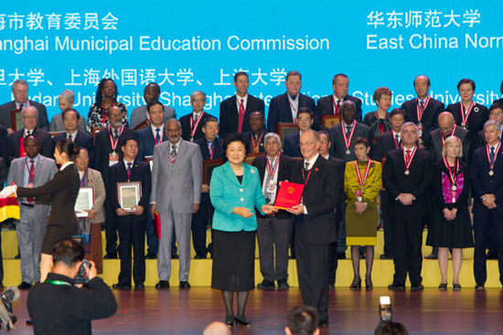 孔子学院总部理事会主席刘延东为孔子学院先进集体和个人颁奖,为示范孔子学院颁发证书,宣布成立孔子学院校友会。(摄影:中国日报记者 高尔强)