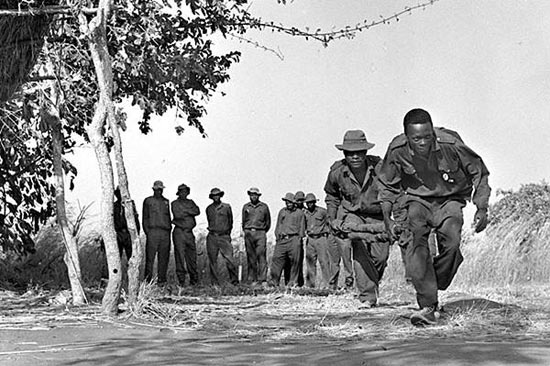 1970年,津巴布韦游击队战士练习战场救护的资料图片。(新华社发)