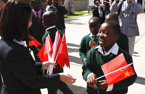 2012年6月26日,一名津巴布韦小学生在中国驻津大使馆举行的“开放日”活动上接过中国国旗,并学说“你好”。(新华社记者许林贵摄)