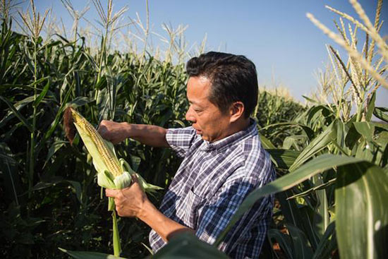 2015年11月11日,在津巴布韦奇诺伊的温亚尼农场上,中方企业晥津公司总经理何宏顺展示农场出品的青玉米。(新华社记者许林贵摄)