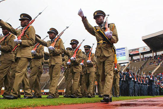 2015年4月18日,在中国援建的津巴布韦国家体育场内,津国防军进行表演。(新华社发,费列蒙摄)