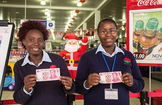 2015年11月19日,在津巴布韦首都哈拉雷一家超市前,两名售货员拿着人民币摆拍。(新华记者许林贵摄)