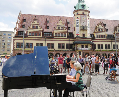 图为比吉特·波尔特(右)和学生在莱比锡市中心广场的露天音乐会表演四手联弹。