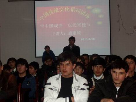 新年伊始,塔吉克斯坦民族大学孔子学院2011年度中国传统文化系列讲座正式拉开序幕。2011年2月18日下午,孔院部分学生汇聚在孔子学院活动大厅,一起聆听了一堂别开生面的中国戏曲文化讲座。