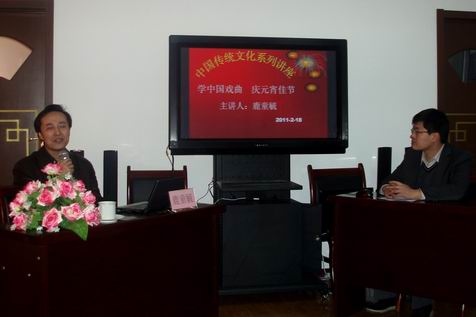 此次讲座由鹿童毓先生主讲,作为资深戏友,鹿老师对中国传统戏曲有着很深的研究造诣。为了讲好此次讲座,鹿老师针对学生特点,做了充分的准备。在讲座中,鹿老师对中国传统戏曲的发展脉络进行了概述,对一些著名的戏曲及中国人耳熟能详的戏曲人物进行了介绍,同时结合声像资料,对京剧脸谱及主要的京剧流派进行了讲解。整个讲座图文并茂,生动形象。最后,在学生们的阵阵掌声中,鹿童毓先生即兴演唱了几段戏曲选段,让学生们得以近距离地聆听、体味中国戏曲的独特韵味和中国传统文化的独特魅力。