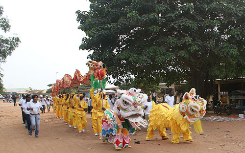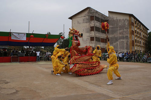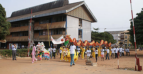 兔年春节大年十五下午四点多,在阿波美卡拉维大学学生宿舍旁的五人制足球运动场上,临时搭起的演出棚里,象征着中华民族节日喜庆的大红灯笼高挂起,红红的中国结在风中不停地摆动着摇曳的身姿,伴随着巨型扬声器里传出了一阵阵动人心弦的中国歌曲旋律,来自贝宁中国文化中心的舞龙舞狮表演队的十多名贝宁汉子踏着铿锵有力的龙狮舞步和数十名阿波美卡拉维大学大学孔子学院学生组成的舞龙舞狮游行队伍向大学的主校园区出发了。由此,拉开了阿波美卡拉维大学孔子学院兔年“欢乐春节”大型庆祝活动的序幕。同时,也使这所有着五十多年历史的西非名校翻开了中华文化传播活动新的一页。