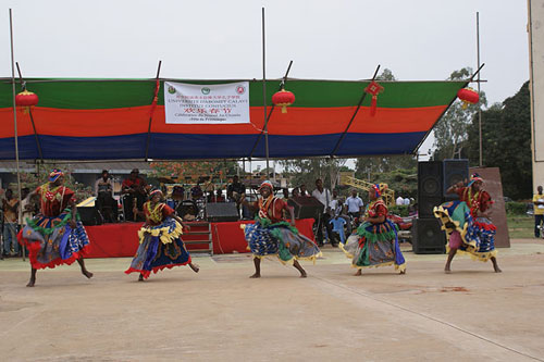 半个小时后,游行队伍回到了“欢乐春节”庆祝活动的主场地,在大学学生乐队和歌手演唱的节奏明快,旋律高亢的贝宁乐曲伴随下,主持人宣布庆祝大会正式开始。相继出台表演的学生民间艺术队和孔子学院学生中文歌曲演唱队等十多个节目,吸引了现场千余名师生和当地群众,贝宁学生良好的乐感和富有激情表演、以及善于组织的互动能力很好地调动了现场观众的情绪,赢得了观众阵阵地掌声和喝彩,使整个庆祝活动高潮迭起,精彩纷呈。由此,极大地提升了孔子学院的形象,使阿波美卡拉维大学的师生们对成立仅有一年的孔子学院有了更深、更广的认识。