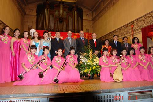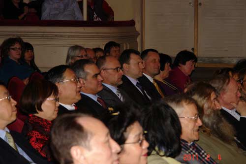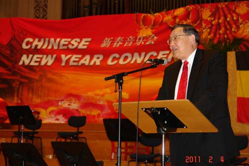 比中协会副主席林娜女士向来宾致欢迎辞。她首先回顾了比中协会成立与发展的厉程,以及协会在促进中比两国建立外交关系和推动两国民间经贸、文化、教育交流方面所做的努力,并表示今后协会要继续为增强两国友谊做出自己应有的贡献。张援远大使随后发表了热情洋溢的讲话,并向来宾致以新春的问候。在讲话中,他介绍了近年来两国高层领导的互访,肯定了中比建交四十年来在各个领域取得的成绩。他强调,在经贸领域,中比两国贸易总额从建交之初的2千万美元左右上升至去年双边贸易额再次突破200亿美元;文化、教育、科技方面等各个领域,双方都签订了合作协定。学生交流越来越多,孔子学院也在比利时生根开花。张大使还介绍了中国十二五规划转变经济发展方式的思路和坚持改革开放,坚持走和平发展道路,坚持互利双赢的思想。最后,张大使预祝音乐会取得圆满成功。比利时外交部双边关系司司长Muylle先生也在致辞赞扬了比中协会在中比关系发展中发挥的重要作用以及布鲁塞尔孔子学院在介绍中国文化、教授汉语方面的积极贡献,成为推动双边文化教育交流的使者。Muylle先生还特别表示,中国经济的发展的同时,对外交往也越来越体现出文化大国的形象。