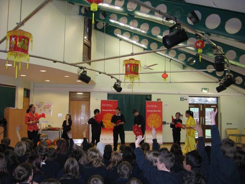Hove Park School 的新年,由学校邀请的中国艺术团的迎新表演拉开序幕。1月26号下午,来英国巡演的黑龙江中医药大学艺术团应学校邀请前来演出。演出共进行了两场,场场精彩纷呈,座无虚席。除了Hove Park本校的学生,演出还吸引了附近Benfield Junior School的小学生前来观看。学生们被极具特色的舞狮表演,太极扇,中国功夫,手帕舞和藏族舞蹈所吸引。每个节目结束,都会有演员和学生的互动环节,学生们争先恐后地上台尝试转手帕,学中国功夫,赢奖品,真应了一句话:欢天喜地过大年。