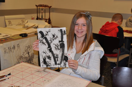一名学生展示她画得竹子