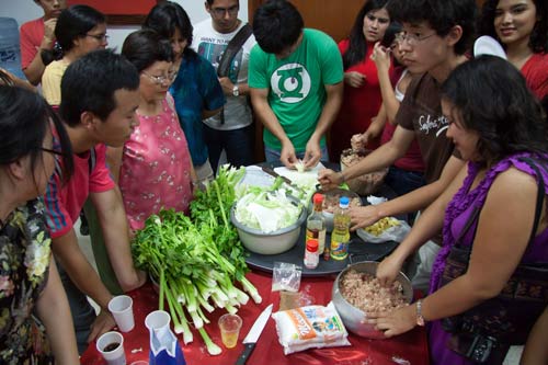 春节前一天,孔院所有的老师齐上阵,用中国驻秘鲁大使馆赠的大红灯笼将孔院装扮起来。除夕下午三点,老师们将鲜肉、蔬菜、面粉带到孔院,就一道道工序开始做了起来。