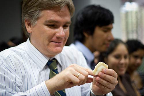 皮乌拉大学法律系主任卡洛斯•哈肯森•涅多做出一个饺子