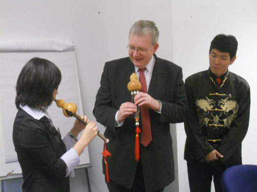 会议快结束时,孔子学院的中方院长刘红杰老师对部长先生对汉语教学工作的关心与支持表示由衷的感谢,并代表孙惠玲局长和老师向部长先生赠送了礼物---中国传统民族乐器葫芦丝。来自的东邓巴郡孔子课堂中心方伟芳老师用葫芦丝为教育部长当场演奏了一曲苏格兰民族歌曲《友谊地久天长》。部长先生还兴致勃勃的跟方老师学起了演奏葫芦丝。
