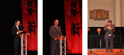 中国驻英国大使馆公使秦刚、公使衔文化参赞吴逊、谢菲尔德市市长艾伦•罗(Alan Law)、市议长保罗•斯克里文(Paul Scriven)以及谢菲尔德大学、当地侨界代表等嘉宾应邀出席。谢菲尔德大学孔子学院院长臧小伟教授、副院长赵霞博士也出席了活动。秦刚公使致开幕辞,向各位嘉宾和朋友们拜年,祝愿大家兔年幸福安康。他说,春节是中国人民最期盼、最盛大的节日。近几年,英国当地的春节气氛越来越浓,春节传统文化通过海内外中国人的共同努力,正逐渐传播到世界各地,成为中国文化的象征。斯克里文议长在致辞中表示,中国春节是了解中国的窗口,越来越受到当地民众的喜爱。谢菲尔德市希望同中国加强在教育、文化、经贸等各个领域的交流与合作,并预祝演出取得圆满成功。