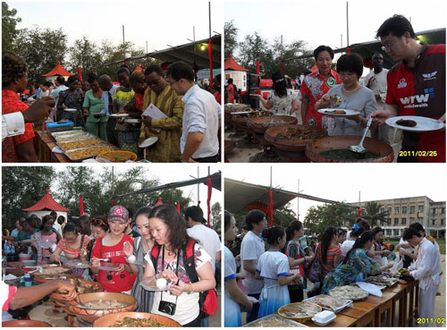 2月24日下午,在北京交通大学艺术团的第二场精彩演出后,洛美大学孔子学院中多饮食文化交流活动正式开始。洛美大学副校长葛飞•阿巴加纳(Koff Akpagana)、洛美大学相关二级学院和职能部门负责人、北京交通大学艺术团的师生、洛美大学师生及各位来宾一起品尝了中多特色美食。艺术团的演员们拿出从中国带来的绿豆糕、沙琪玛等特色食品参与饮食文化交流。大家既品尝了饺子、包子、葱油饼等中国传统美食,也品尝了福福、酸辣鸡、木薯糕等多哥传统美食。虽然饮食习惯各不相同,但大家在品尝两国美食的同时,两国的文化得到了良好的交流和融合。