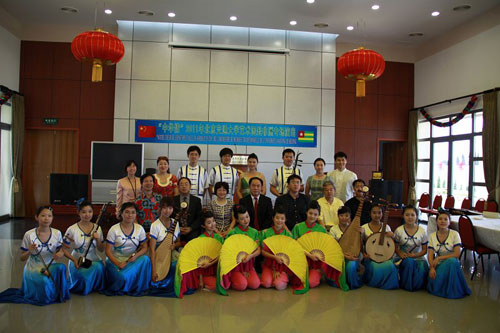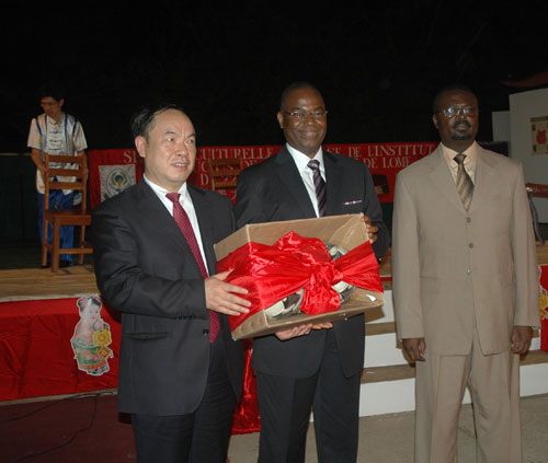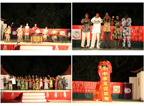 开幕式后,赴非洲巡演的2011北京交通大学艺术团以“中华情”为主题为大家献上了一场精彩的文艺节目。弹拨乐合奏《喜洋洋》、舞蹈《雨后桃花红欲燃》、武术表演《金狮闹春》等颇具中国传统文化特色的节目,赢得了观众热烈的掌声和喝彩。孔子学院的学生也登台用中文表演了他们创作的节目。他们身穿多哥民族服装,唱着中国歌,跳着中国舞,秀着中国话,现场气氛互动热烈,掌声不断。在孔子学院的群口相声《成立中文俱乐部》中,同学们表演了太极拳、绕口令、背唐诗、演唱中国歌等节目,引发了现场观众的阵阵掌声和极大的赞叹。文艺演出在北京交通大学学生和孔子学院学生共同演唱的《我和你》的歌声中走向尾声。演出结束后,北京交通大学艺术团向洛美大学孔子学院赠送了狮舞道具和武术道具,孔子学院向艺术团回赠了具有非洲特色的艺术品。