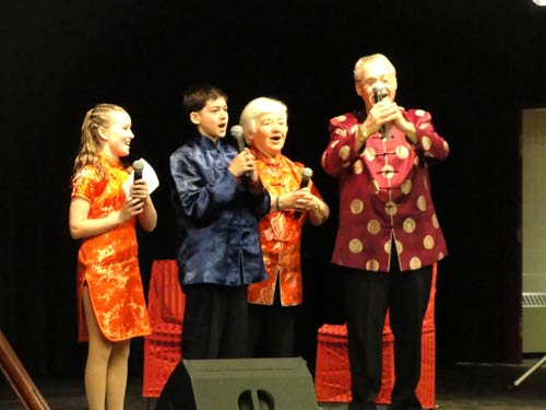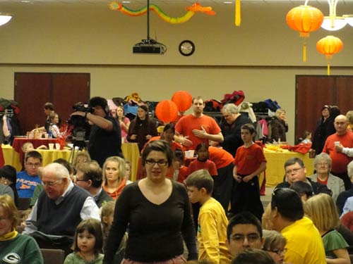 威斯康星州普拉特维尔大学的两位大学生,马克和詹慕斯,同时也是孔子学院汉语班的学生,上台用标准的汉语对观众演示如何说新春佳节常用语。在孔子学院少年汉语班和成人汉语班的学员代表领唱下,全场观众一起唱响<<恭喜、恭喜>>这首备受欢迎的新春祝福歌,现场气氛非常热烈。