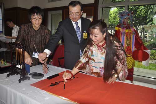 红溪礼示大学孔子学院为此次闭幕式精心组织了大型中国文化体验活动,吸引了众多亚行成员国的官员和专家。中国驻菲大使刘建超亲临现场,即兴题词“多元文化,相融共进”,邀请并引导来自美国、韩国、乌兹别克斯坦、菲律宾等国的亚行国际职员共同挥毫书写。掌声雷动中,中国大使以其独特的魅力,为中国文化“和而不同”的核心内涵做出了最完美的诠释。