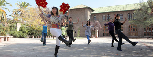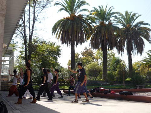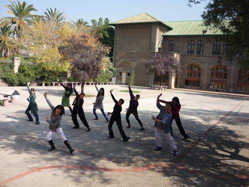 从四月份开始天主教大学孔子学院汉语俱乐部特别为学生及当地民众开设了中国舞蹈班、中国诗歌朗诵班、中国歌曲班及24式简化太极拳班,并通过电子邮件、海报宣传等形式向智利社区各界人士发出了邀请。消息一经发出,便吸引了众多热爱中国文化的智利朋友的参与。从此,每个星期五孔子学院都成为天主教大学校园内最活跃、最有朝气的角落。只见孔子学院教室内诗声朗朗、歌声缭绕;教室外一群姑娘们正在饶有兴趣地学跳中国舞,另一群人正在有滋有味地学打中国太极拳。这些景象无不引起过往学生的关注和拍照。每次课程结束时,学生们都意犹未尽并报以热烈的掌声,他们通过这些活动切身体会到了中国文化艺术之美,中国文化的和谐之美。其乐融融的气氛注入了在场每一个人的心田,学生们的掌声也给与了老师们最大的鼓励和鼓舞。