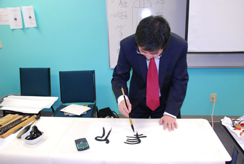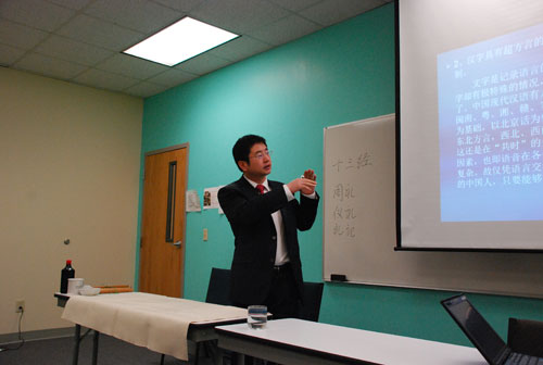 2月27日,费佛尔大学孔子学院邀请来美进行中国书法讲座的首都师范大学赵宏教授给孔子学院的全体汉语教师做了《汉字的认知与书法的欣赏》的专题讲座。赵宏博士是一位很有成就的书法博士、书法家和篆刻家(中国邮政曾出版他的篆刻作品邮票),赵宏教授擅长篆书体,对古文字的研究颇有建树。如何深入地了解我们中国的文字、理解东方文字和书法的审美方式、怎么让美国学生学习汉字和理解中国书法的美,这些都是孔院教师们希望通过交流探讨的问题,大家都很珍惜这次难得的机会和专家进行面对面的交流。