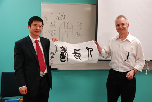 《汉字的表现与认知》是欧阳中石先生携赵宏博士(赵宏博士是欧阳中石先生的学生)等一班人马目前正在进行的一项汉字教学的研究,这套体系能否运用于未来的汉语教学,能有机会和孔子学院的汉语老师们面对面的讨论这一新的理念,获取第一线汉语教师们的建议和思路,对赵宏博士来说也是一次有益的交流。在交流过程中,孔子学院院长闫伟红以他多年汉语教学的第一线经验,和他自己学习3种外国语(意大利语、法语和西班牙语)的经验以及他本人对西方学生学习心理的了解,他提出了对此项目的个人见解和思考,也提出了更加有效的教学法配合这一学术理念的完善,值得学术界思考。