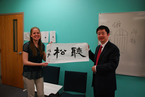 Emily的家人给了孔子学院很多的帮助,闫伟红院长请赵宏教授送上一幅字表示对他们全家的感谢