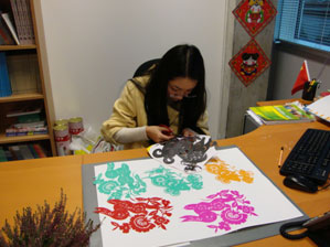 中国农历兔年新春伊始,杜伊斯堡-埃森大学鲁尔都市孔子学院在刚刚举办了新年联欢晚会之后,又揭开了中国文化系列展的序幕。3月1日,孔院的第一个展览——中国剪纸艺术正式揭牌。展出的色彩斑斓的剪纸作品别具特色——中国的12生肖,由孔子学院的志愿者教师唐静瑶女士利用课余时间精心制作完成。经过精巧装裱,整整齐齐悬挂在孔子学院长廊墙上的剪纸生肖生动可爱、栩栩如生、魅力非凡,犹如12种生命在墙上游畅。每幅作品都配有中文和德文名称,还有德文介绍中国剪纸艺术文化的专框。此时的长廊俨然成为一个真正的中国文化走廊。