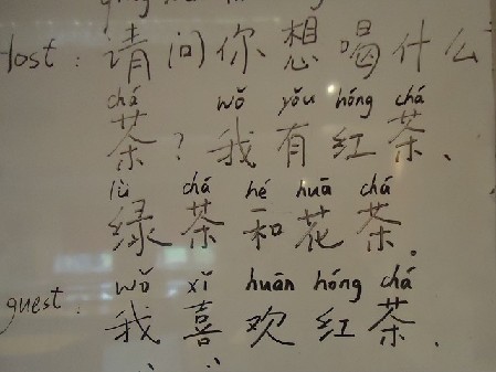 在学生们迫不及待地想喝中国茶时,胡老师又卖了一个关子。她先介绍了中国奉茶的待客之道,又演示给学生如何持杯,如何品茗。同时又潜移默化地教学生们用汉语对话:“请问你想喝什么茶?”“你们有什么茶?”“我们有红茶、绿茶和花茶。”“我要一杯绿茶,谢谢!”学生们饶有兴致地边对话边开始品尝来自中国的茶。( 英国专长学校联合会孔子学院胡亚玲)