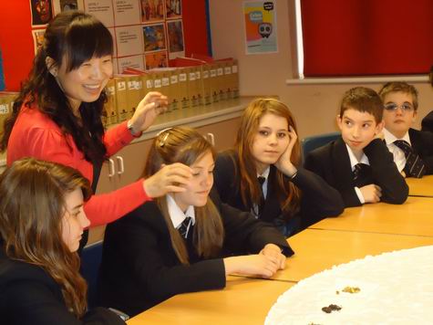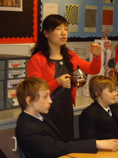 在浓郁的中国文化氛围里,来自英国专长学校联合会孔子学院的汉语教师与圣休斯中学的语言教师一起向学生们介绍中国茶道。从闻香静气、悬壶高冲、凤凰点头到捧杯敬茶,众手传盅,既有简短的视频介绍,也有教师的现场表演与说明。学生们听得津津有味。不待教师讲演完,大家已经按捺不住,抢着举手发言。有的骄傲地向大家介绍他们已经了解的中国茶的知识和自己相关的经历:“老师,我知道中国人把black tea 叫red tea。”“我喝过中国朋友送的绿茶,很香!”有的则提出了更多的关于中国茶的问题。“中国红茶和英国茶一样,是吗?”“中国人真的认为茶和面包一样重要吗?”“中国的茶为什么没有用茶叶包包起来,而是直接泡叶子呢?是直接摘来就泡着喝吗?”