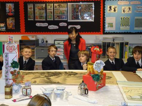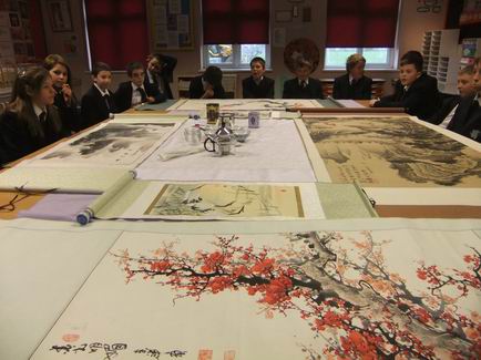2011年4月的一天,英国林肯郡格兰瑟姆镇圣休斯中学的学生们团团围坐在在一起,大桌子上铺开了许多卷中国传统山水、花鸟书画,教室里播放着悠扬动听的中国民族音乐。桌子正中间,摆放着一套精美的中国茶具。原来,这是孔子课堂的师生们正在举办茶文化活动。