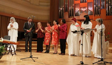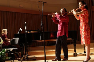 传统的中国竹笛、古筝与西方的钢琴联袂演奏的中外名曲,令人如醉如痴。刘正国教授的“空管吹律”、“双管同吹”以及即兴“卷纸成管吹奏”等绝技更是技惊四座。中斯全体演出人员共同演奏和合唱的“茉莉花”引起了全场共鸣。音乐会现场观众反响热烈,演员先后返场三次,大家才恋恋不舍地离开剧场。