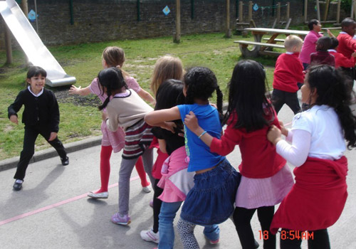 踢毽子、放风筝、跳皮筋、跳房子、跳绳、打陀螺、丢手绢、滚铁圈、翻花绳和老鹰捉小鸡,众多趣味十足的中国传统游戏深深吸引了每一位同学甚至该校的英国老师们。孩子们通过听、看、读、想、玩,充分感受到了中国传统儿童游戏的快乐魅力。活动中,他们大声的用刚学到的中文表达着自己的感受:“我爱中国 Games。我爱中国!”
