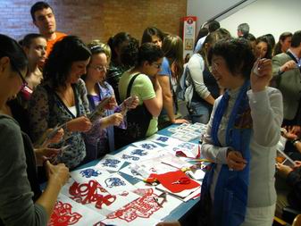 5月13日,艺术家们一行风尘仆仆地又来到本院5个孔子课堂之一的Fonseca语言高中,向广大的中学生传授书画、面人、剪纸等艺术,受到了师生们的热烈欢迎。许多学生和教师围在艺术家们面前,一会儿看书法,一会儿看剪纸,一会儿又看面塑,个个看得如痴如醉。师生们个个充满了好奇,纷纷跃跃欲试,要求现场学艺。艺术家和师生们频频互动,让他们亲身感受中国文化的魅力。现场不时地传来欢声笑语,气氛十分热烈。许多学生在艺术家的指导下,学剪纸、捏面人,手持自己的作品,甚是兴奋、自豪。许多人表示,以前只是听说中国文化很丰富,很灿烂,没想到亲眼目睹,如此神奇,如此富有魅力。
